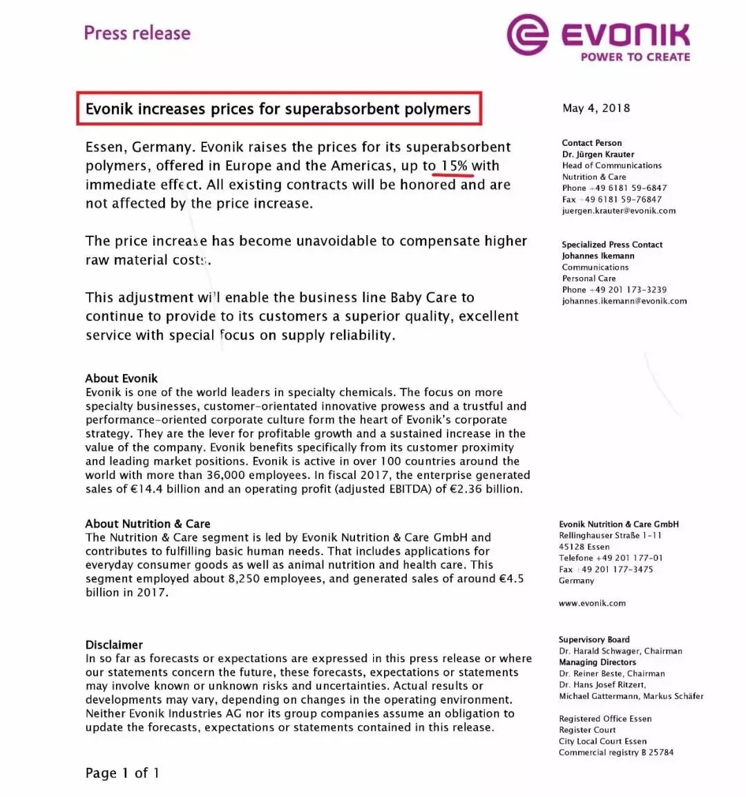贏創宣布5月4日起,全面上調歐洲和北美地區超吸水性樹脂的價格,上漲幅度為15%。