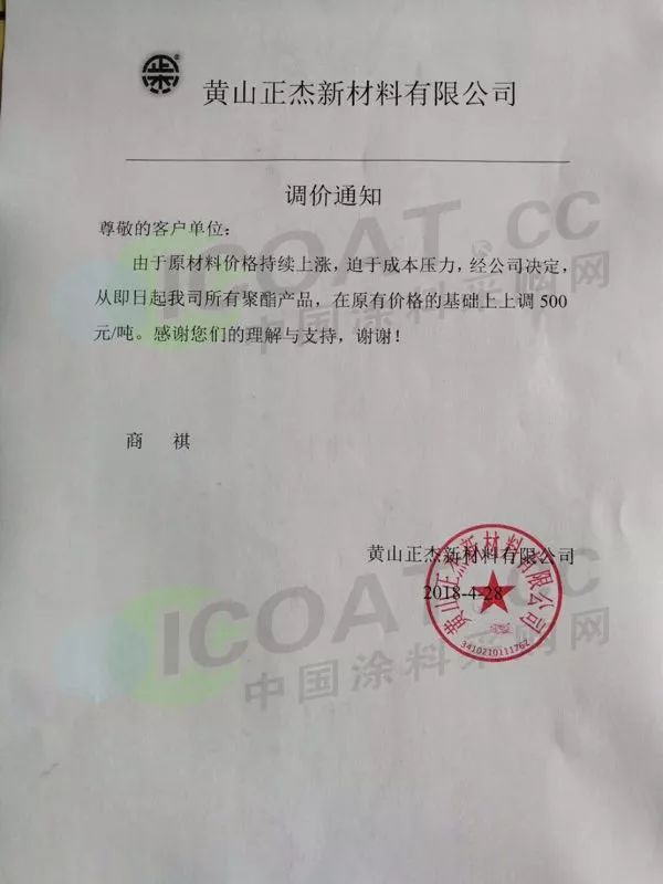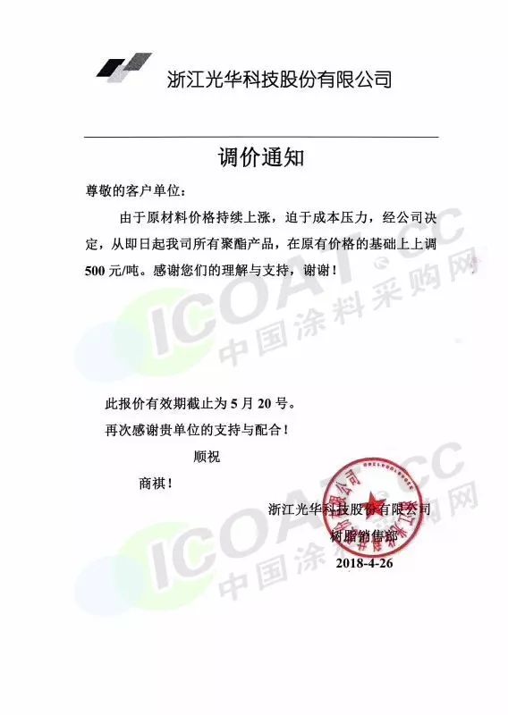 昆山三旺樹脂有限公司、廣州俊希新材料有限公司、廣東柯力森樹脂有限公司、清遠雅克化工有限公司、浙江德尚化工科技有限公司也都紛紛發布了漲價函。